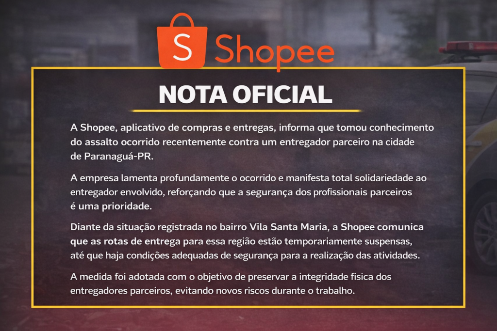 “A Shopee informa que tomou conhecimento do assalto ocorrido recentemente contra um entregador parceiro na cidade de Paranaguá. A empresa lamenta profundamente o ocorrido e manifesta total solidariedade ao entregador envolvido, reforçando que a segurança dos profissionais parceiros é uma prioridade”, diz parte da nota.